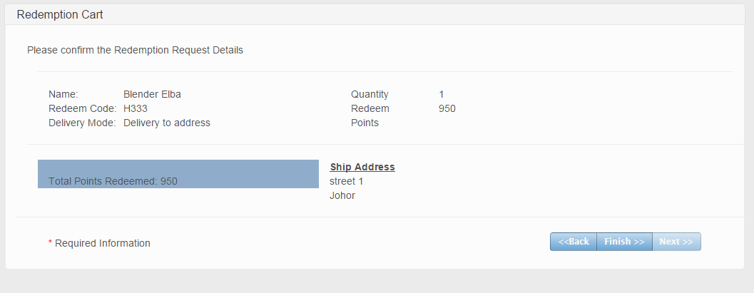 After the user clicks on the “Next” button in Delivery Information page, user will be shown a Confirmation Page for the Redemption Request. Click on Finish to confirm the Redemption request.