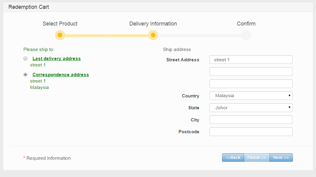At any point in Redemption Cart, if the user has not clicked on the “Finish” button in the Confirmation page, the user can still click on the “Back” button to modify the Redemption Cart information.