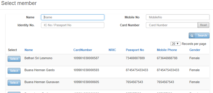 Click on “Search” button to search the system. Click on “Select” button next to record to select member for redemption action.
