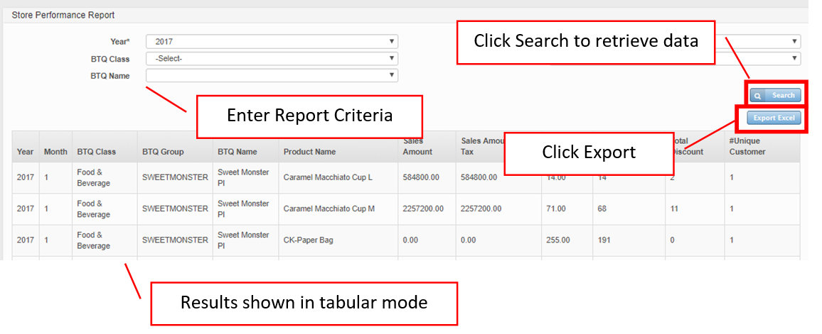 User needs to enter or select the report filter criteria (each report will have their own criteria). User then needs to click on the “Search” button to show the results in tabular mode at the bottom of the page.